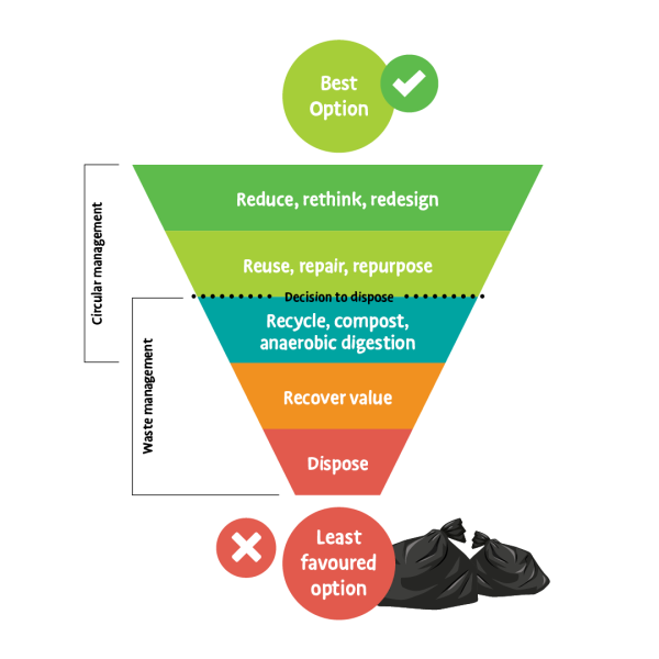 Reduce is at the top of the hierarchy, because if we do that first, there’ll be less waste left over to dispose of.